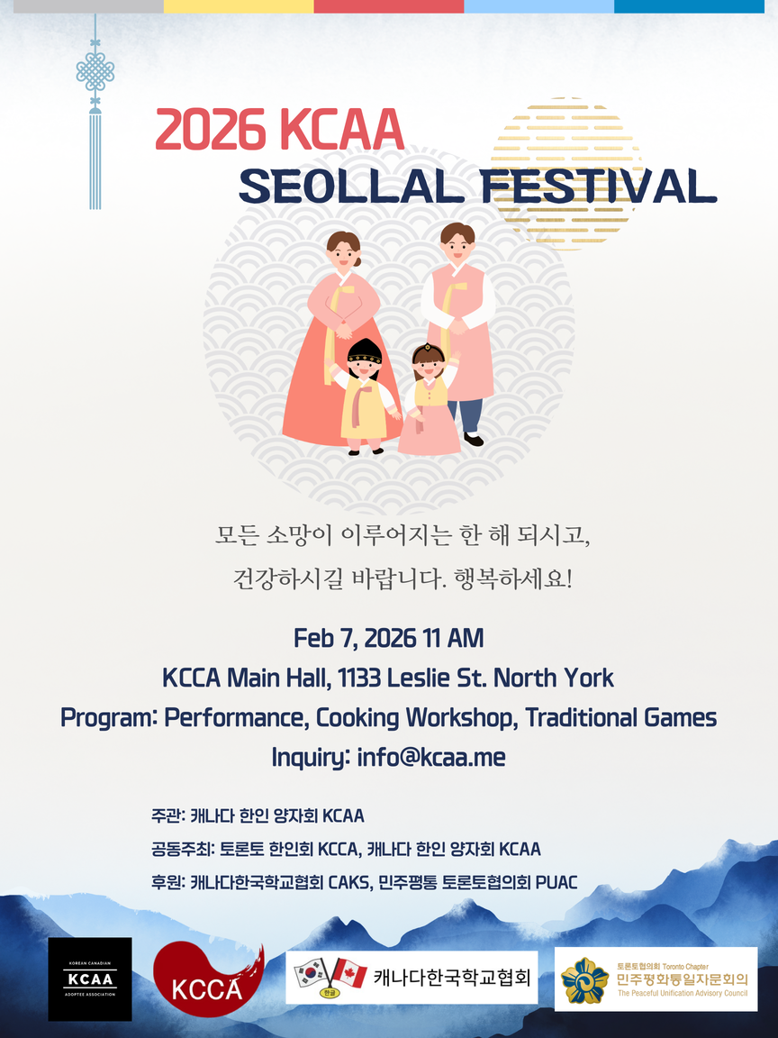 2026 캐나다 한인 양자회 초청 평화염원 설날 잔치 2026년 2월 7일(토) 오전 11시 – 오후 3시에서 토론토 한인회관에서토론토협의회에서 18기부터 해왔던(21기때는 일년만 진행) 공공외교 행사입니다. 이미 한국에 대해 많은 관심을 가지고