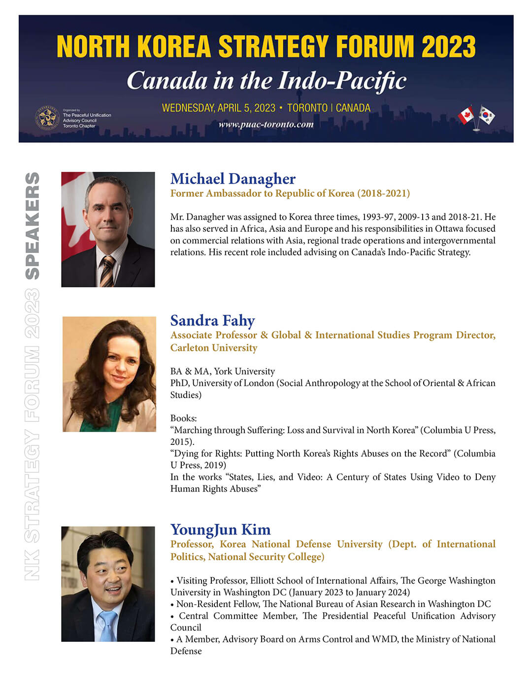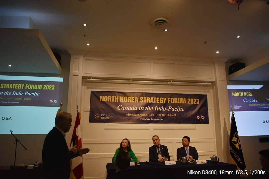 대통령 직속 헌법기관인 민주평화통일자문회의 토론토협의회(회장 김연수, 이하 민주평통)는 지난 4월 5일(수) 오전 11시부터 오후 3시까지 “North Korea Strategy Forum 2023 – Canada in the Indo-Pacific (대북한전략포럼 – 인도태평양의 캐나다 역할)”을 주제로 전문가 포럼을 개최했다. 조성용 토론토협의회 공공외교 위원장의 영어 사회로 진행된 이번 포럼은 마이클 대나허(Michael Danagher) 전 주한 캐나다 대사, 샌드라 파히(Sandra Fahy) 칼튼대학교수, 김영준 한국국방대학교 교수 등 3명이 스피커로 초대되었다. 이외 토론 참여자로 피터 로웬 토론토대학교 국제관계및 공공정책 대학원 학장(Peter Loewen, Director, Munk School of Global Affairs & Public Policy), 비쟌 아마디 북미 싱크탱크인 평화외교연구소 이사(Bijan Ahmadi, Executive Director, Institute for Peace & Diplomacy), 션 정 한보이스 이사(Sean Chung, Executive Director, HanVoice)가 참석했다. 또한 권태한 토론토부총영사, 벤 진 캐나다 수상실 상임고문(Ben Chin, Senior Advisor, Prime Minister’s Office)을 비롯해 캐나다 정치인, 외교관, 평통 자문위원, 언론인 등 60여명이 참석했다 – 참석기관 하단 참조.