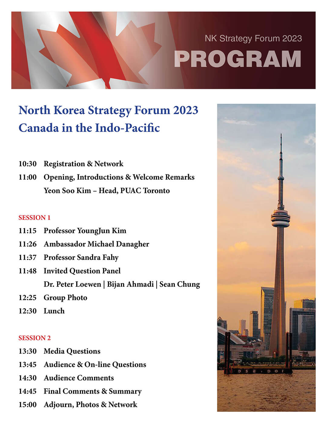 캐나다는 지난 2022년 11월 인도-태평양 전략(Indo-Pacific Strategy)을 발표한 바 있다. 이 포럼은 급변하는 세계 정세 속에서 날로 그 중요성이 커져가는 인도-태평양 지역내 한반도의 지정학적 위치 뿐만 아니라 외교적 입지와 북한과의 관계에 대한 중요도를 다루고, 이를 향한 캐나다의 방향과 역할 그리고 방법을 논의하는 자리였다.