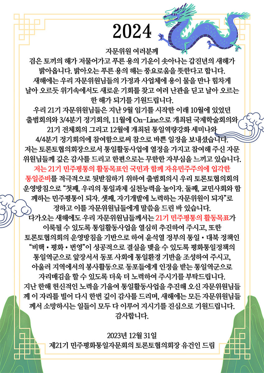 다가오는 새해에도 우리 자문위원님들께서는 21기 민주평통의 활동목표가 이룩될 수 있도록 통일활동사업을 열심히 추진하여 주시고, 또한 토론토협의회의 운영방침을 기반으로 하여 윤석열 정부의 통일•대북 정책인“비핵•평화•번영”이 성공적으로 결실을 맺을 수 있도록 평화통일정책의 통일역군으로 앞장서서 동포 사회에 통일환경 기반을 조성하여 주시고, 아울러 지역에서의 봉사활동으로 동포들에게 인정을 받는 통일역군으로 자리매김을 할 수 있도록 더욱 더 노력하여 주시기를 부탁드립니다.