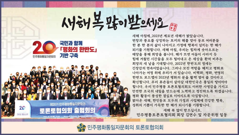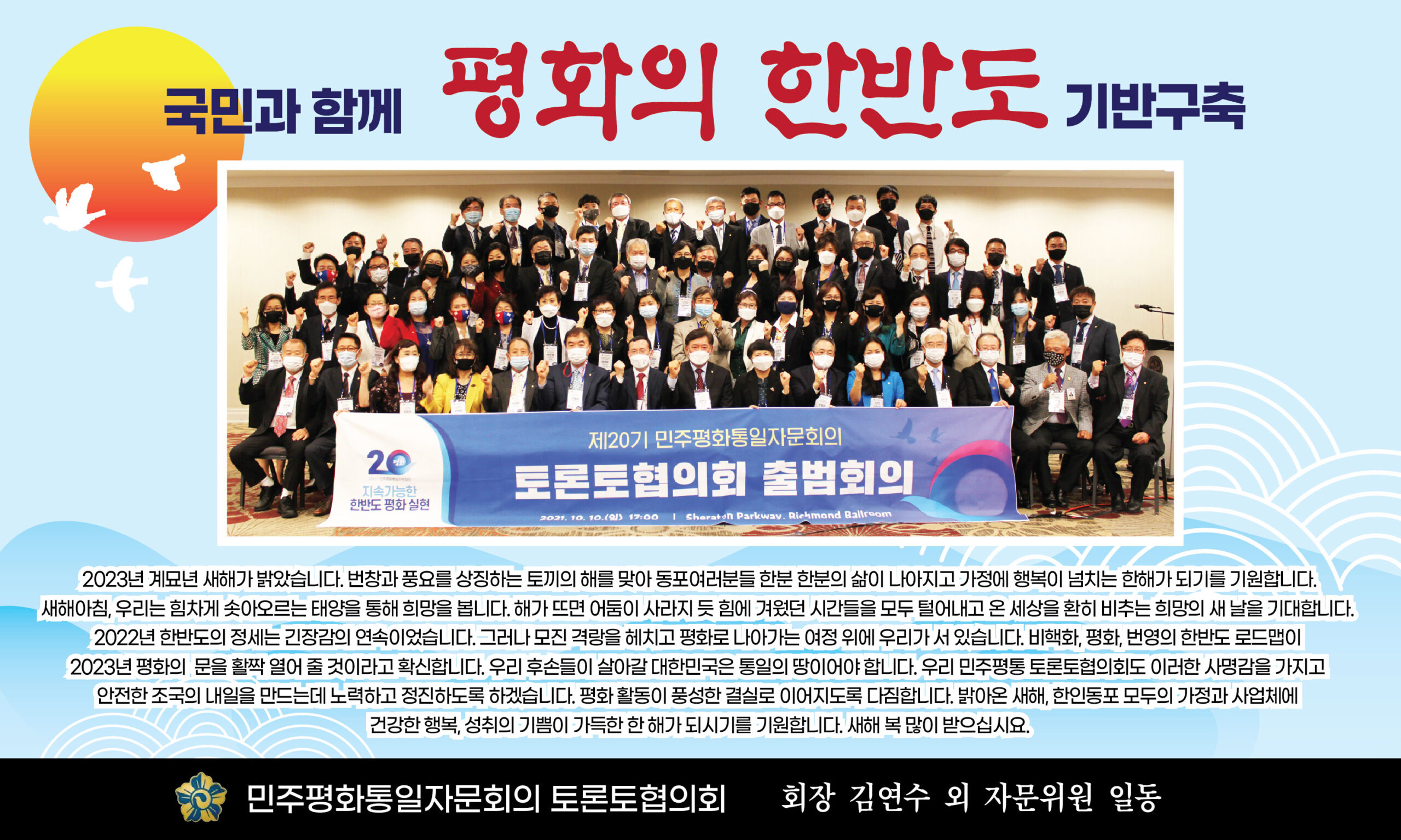 우리 후손들이 살아갈 대한민국은 통일의 땅이어야 합니다. 우리 민주평통 토론토협의회도 이러한 사명감을 가지고 안전한 조국의 내일을 만드는데 노력하고 정진하도록 하겠습니다.